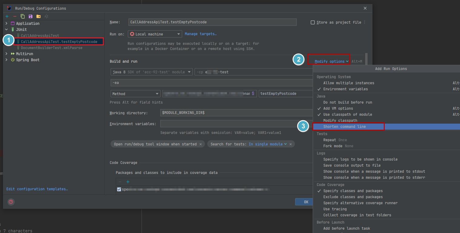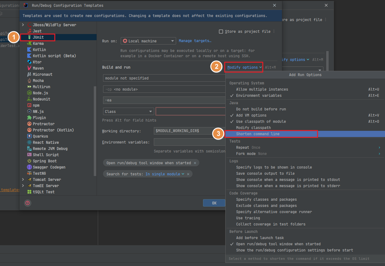 1. 위 화면에 표시된 순서대로 [Modify options]를 클릭 후 [Shorten command line]을 체크합니다.