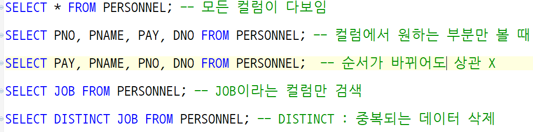 (3) 내가 만약에 PERSONNEL테이블에서 JOB이라는 칼럼만 검색하고 싶을 때 --> SELECT JOM FROM PERSONNEL;