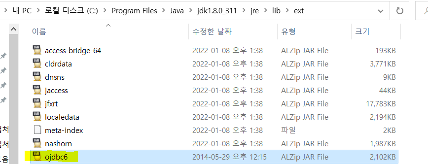 2. 오라클 파일에서 쭉 들어가면 ojdbc6이 있다. 이 파일을 java jdk, jre에 넣어줘야 함.