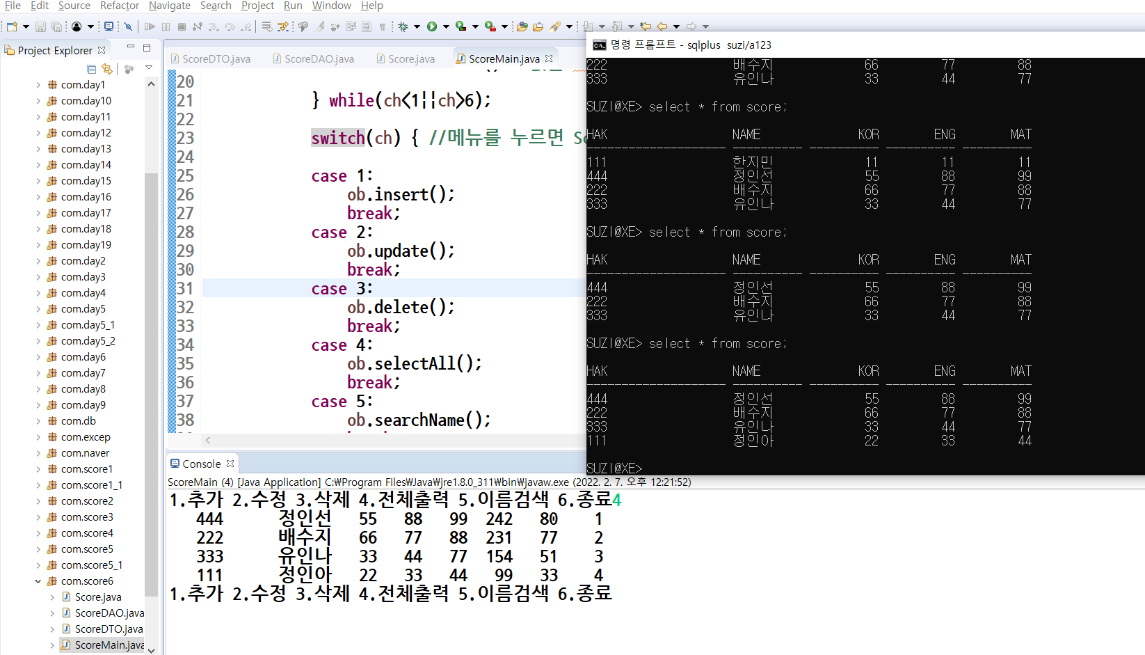 이렇게 프로시저를 생성해주고 ScoreMain 클래스를 실행하면 위의 PreparedStatement를 써서 만든 성적 프로그램과 같은 결과가 나온다!